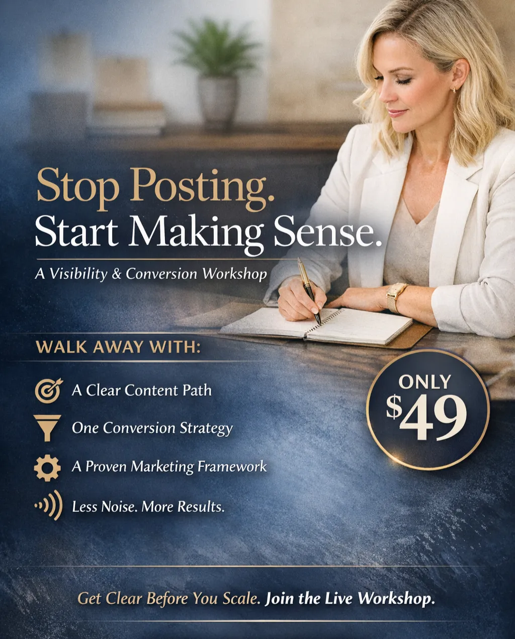 A live 2-hour workshop for founders and team leaders who want visibility that actually supports growth. If your content feels inconsistent, overwhelming, or disconnected from results, it’s not because you’re doing it wrong. It’s because your visibility doesn’t have a clear job. In this working session, you’ll stop guessing, see exactly what’s misaligned, and walk away with a clear, measurable path forward.
